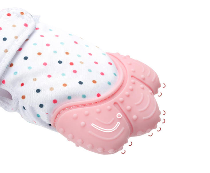Unlike a pacifier or a handheld teether, this glove creates a physical barrier. The baby’s fingers are safely tucked inside the glove, while the silicone chewing area is on the outside. When the baby brings their hand to their mouth—a natural and comforting gesture—they encounter the silicone teether instead of their own skin.